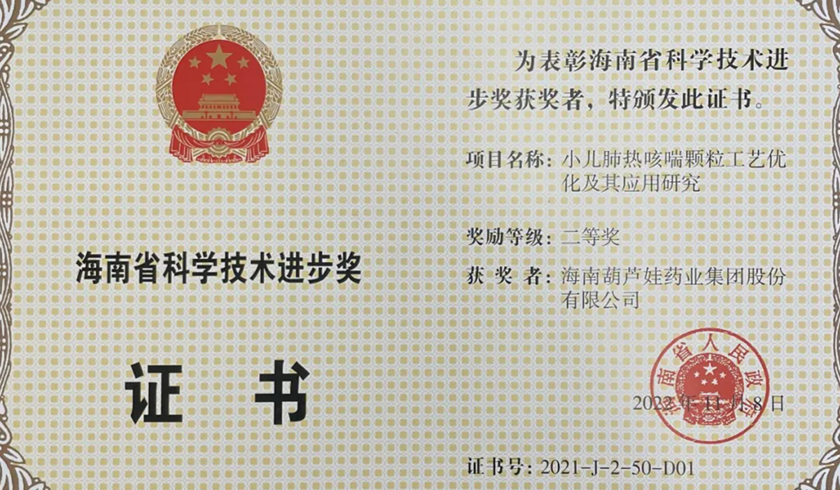 恒峰g22药业集团申报的专利“克咳片及其制备方法”荣获 第四届海南省专利奖金奖