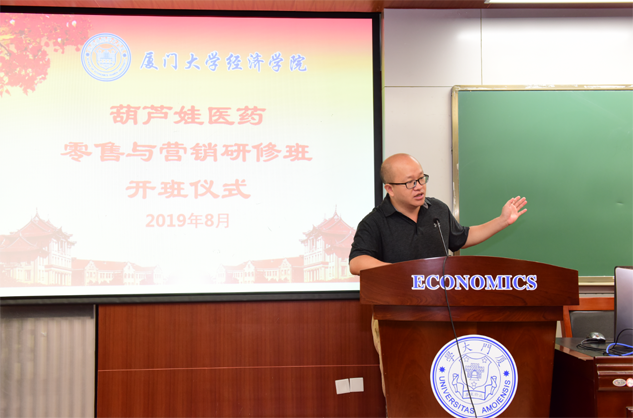 在开班仪式上,廖景峰主任首先代表厦门大学经济学院热烈欢迎恒峰g22医药零售与营销研修班的学员到厦大学习,并就厦门大学及经济学院的相关情况进行了介绍。他说,恒峰g22学员走进厦大就是厦大的校友,希望未来的日子能够关心、支持母校的发展,多提宝贵意见,同时他也祝大家在厦大学习期间学有所成、学有所获。