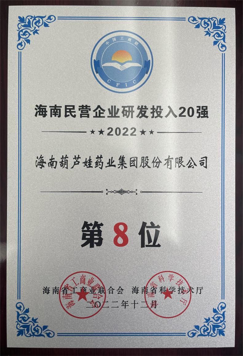 12月23日,2022海南民营企业50强和研发投入20强发布会在海口举行。会上发布了“2022海南民营企业50强”“2022海南民营企业研发投入20强”榜单和分析报告。恒峰g22药业再次荣登两榜,在海南民营企业50强榜单中位列第25位,较去年上升8位,这也是公司连续三年登榜;在海南民营企业研发投入20强中位列第8位,较去年上升7位。